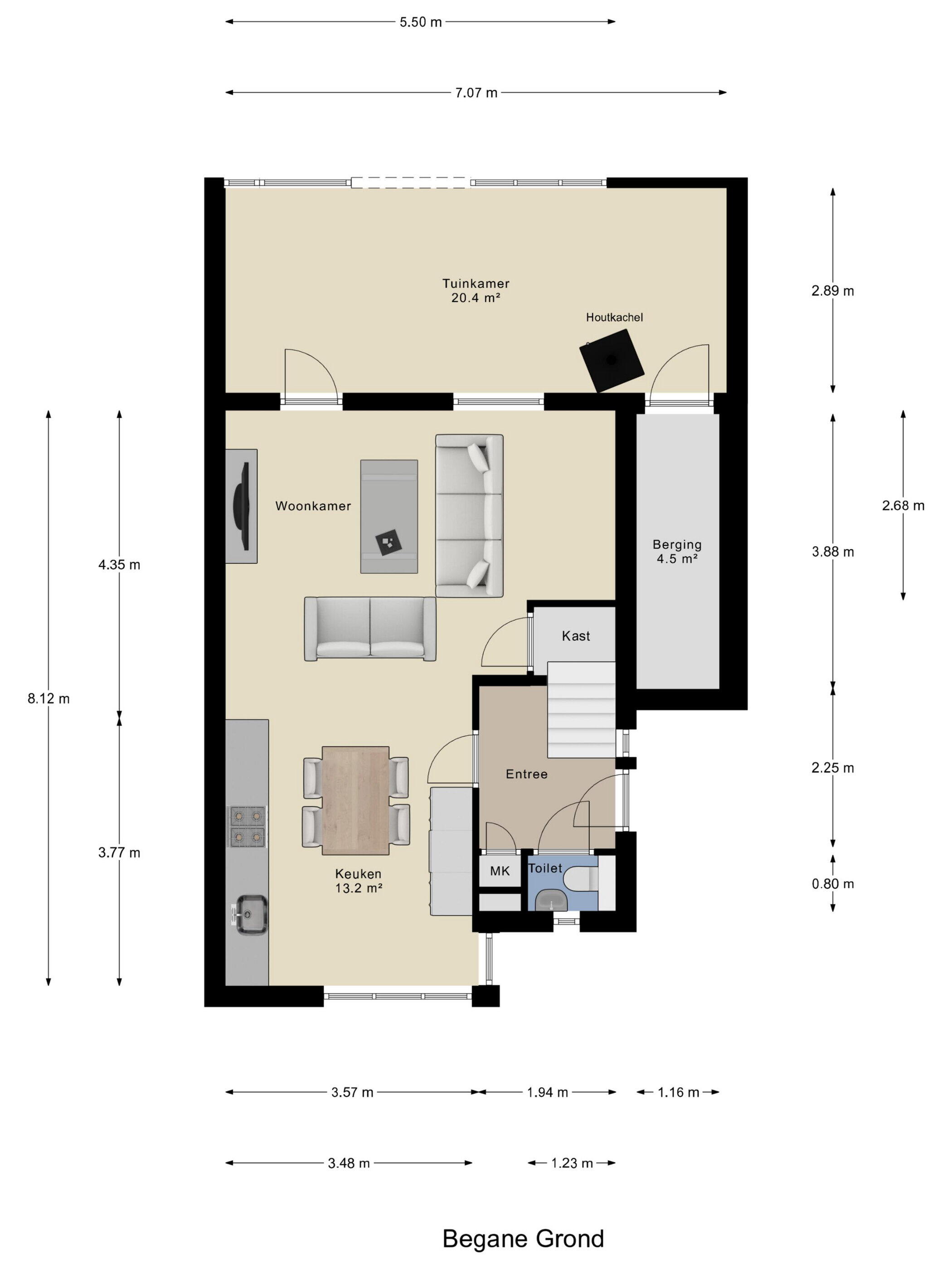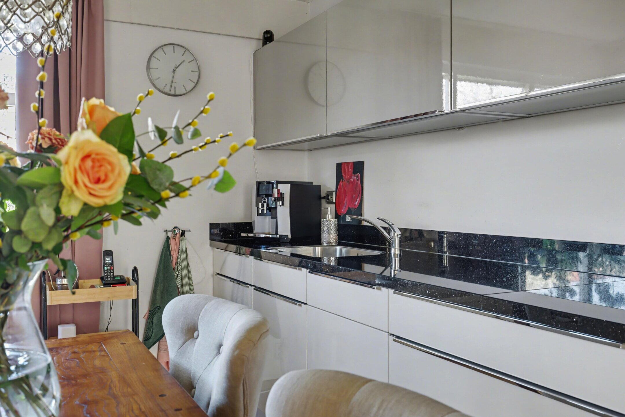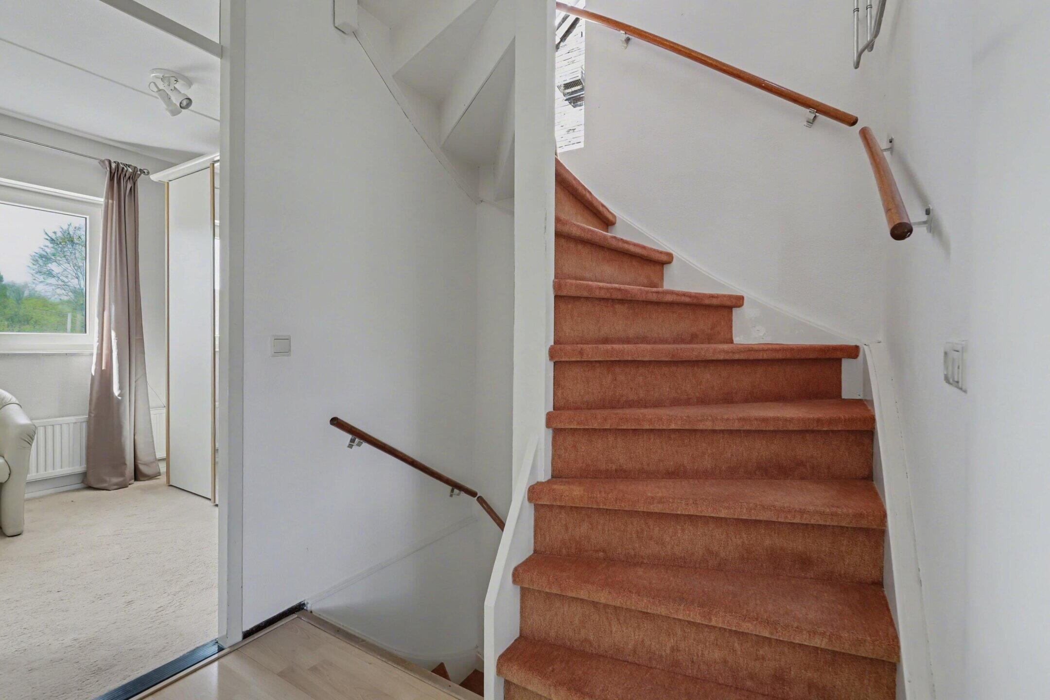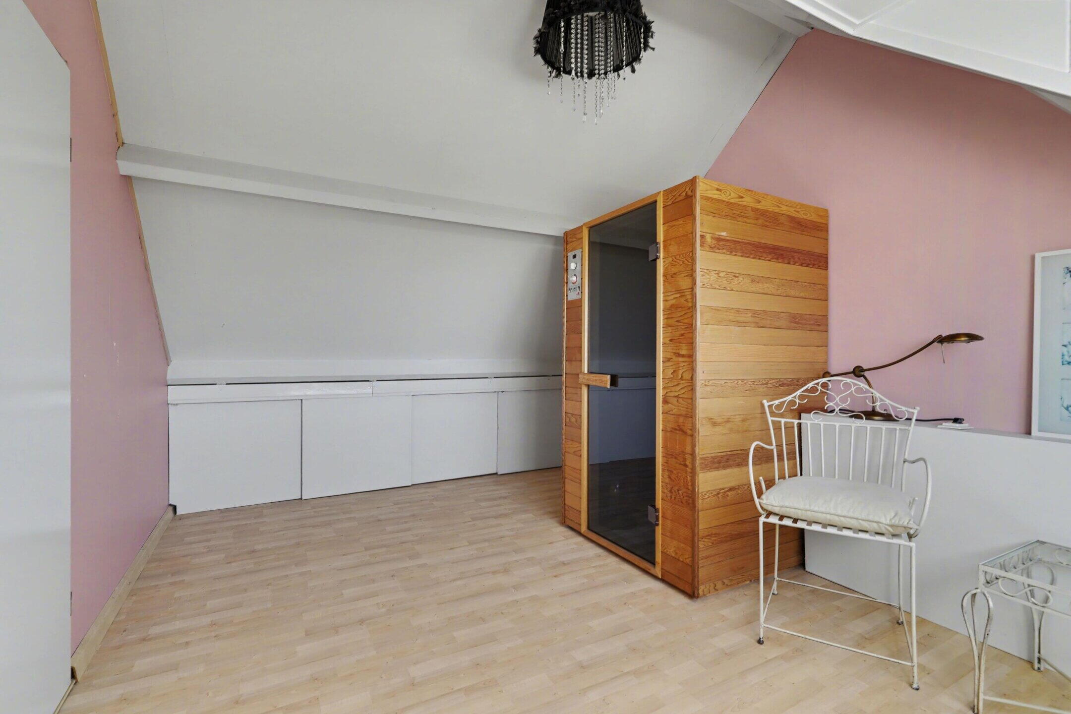 Begane grond: De woonkamer is ruim opgezet en loopt door in de tuinkamer, die als verlengstuk van de leefruimte fungeert. In deze tuinkamer bevindt zich de robuuste houtkachel, die zorgt voor een sfeervol middelpunt. Aan de voorzijde ligt de keuken (2014), praktisch ingedeeld en uitgerust met een oven met stoomfunctie en een relatief jonge vaatwasser (2020). Daarnaast beschikt de begane grond over een provisieruimte en een toilet.