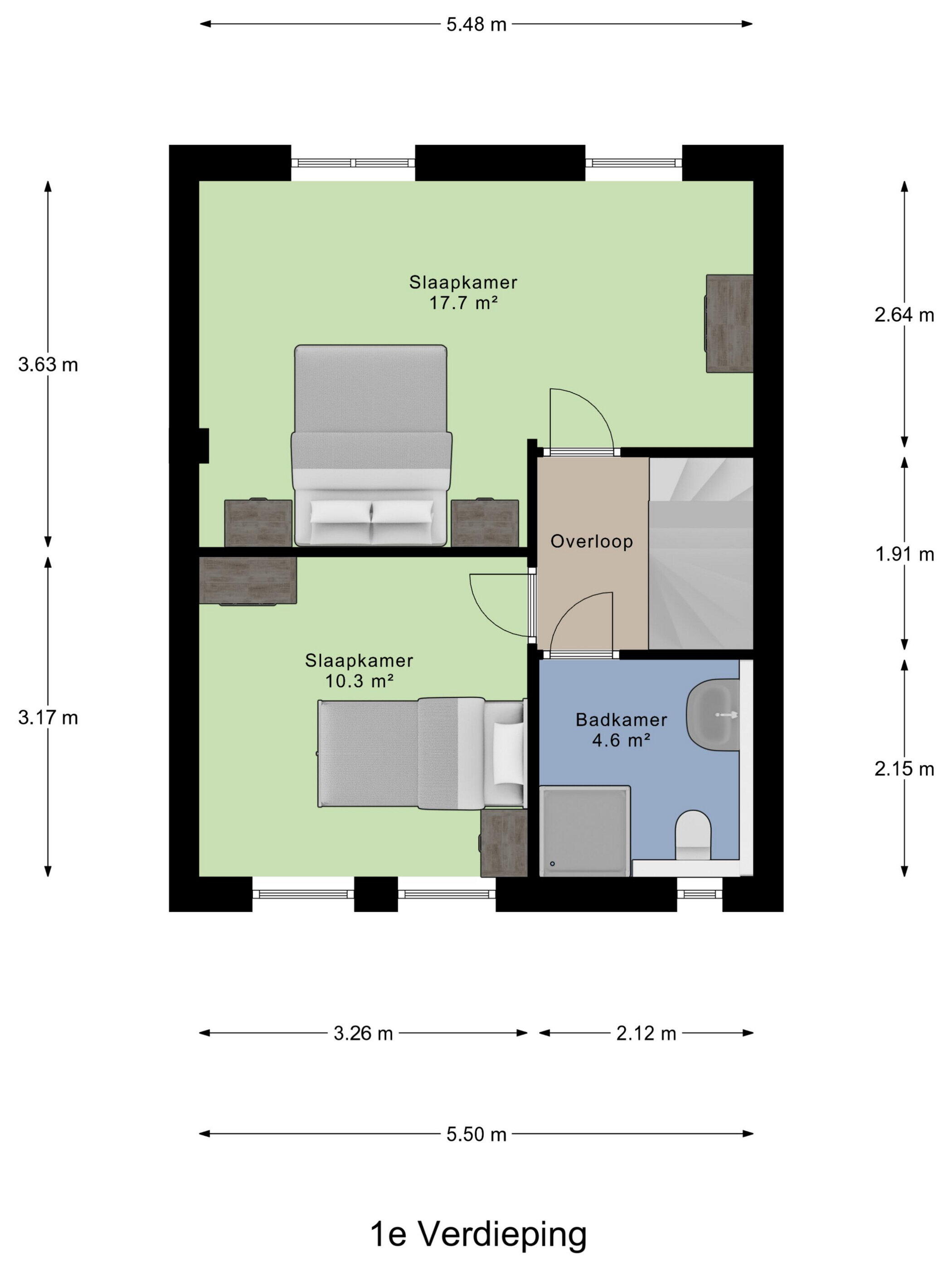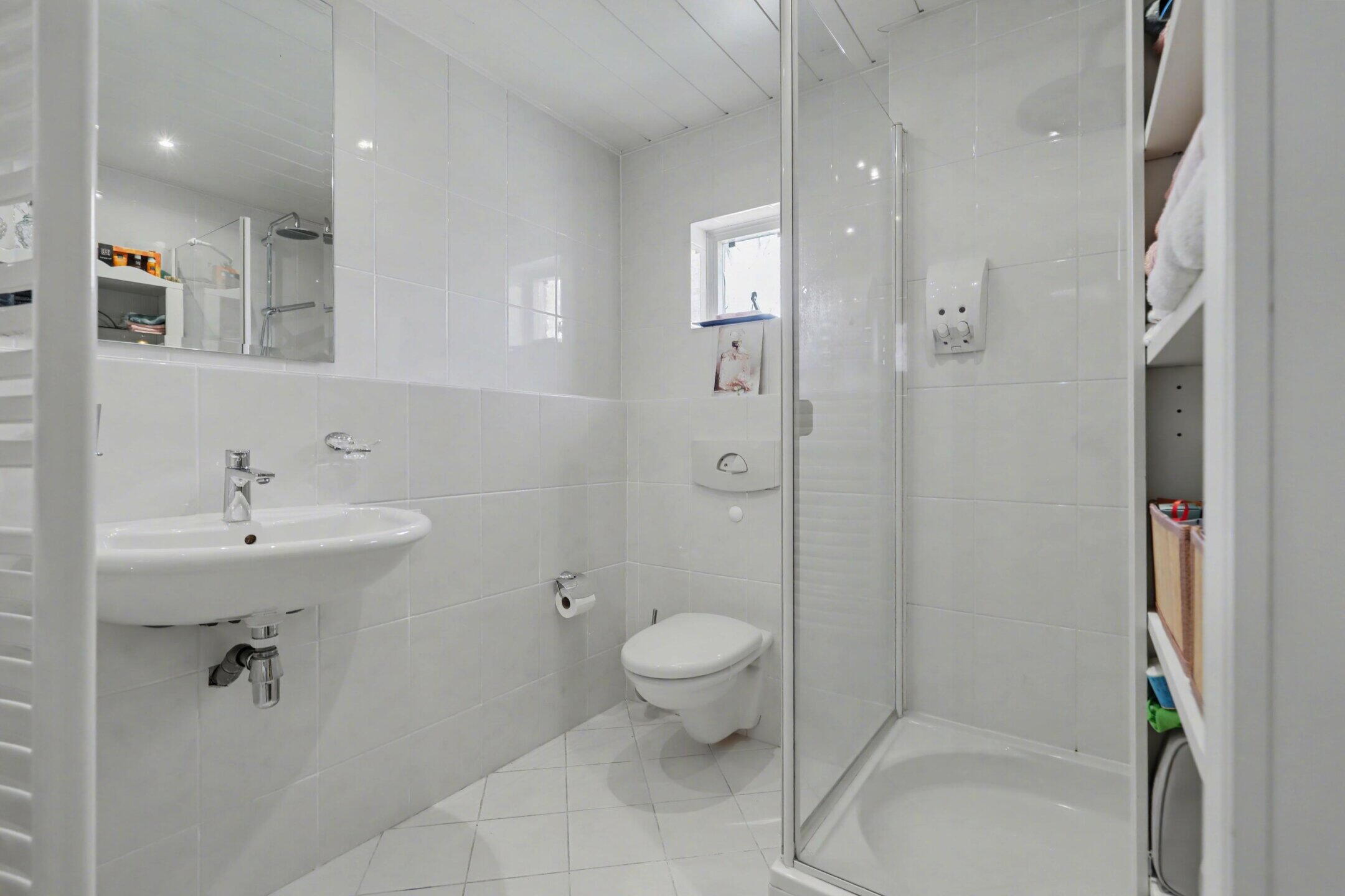 Eerste verdieping: Hier bevinden zich twee ruime slaapkamers en de badkamer met douche, tweede toilet en wastafel. De overloop verbindt de ruimtes zonder onnodig verlies van meters.